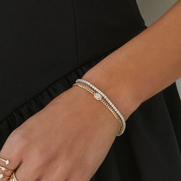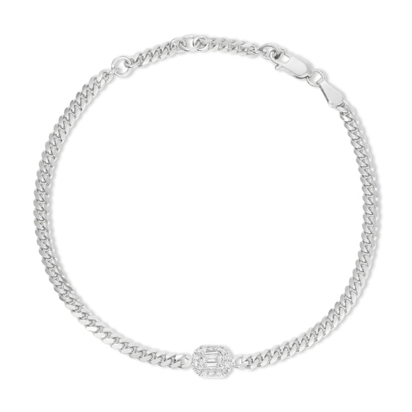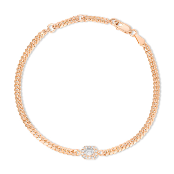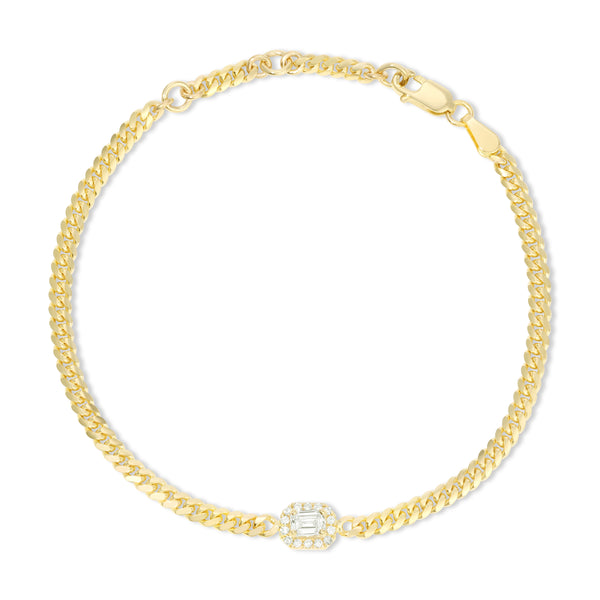 Our Diamond Cuban Chain Bracelet embodies sophistication and chic style. Choose from an exquisite palette of yellow, white, and rose gold. This elegant piece is accentuated with a standout emerald-cut diamond surrounded by a halo of round diamonds, making it a luxurious addition to any collection. Made with lab-grown diamonds and eco-conscious, recycled 14K gold. Handmade in Los Angeles.